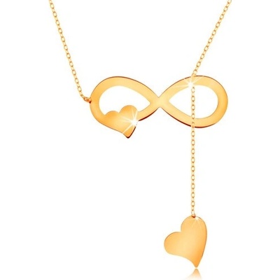 Zlatý 14K náhrdelník, ležatá osmička se srdíčkem a druhé srdce visící na řetízku, jemný řetízek z oválných oček.