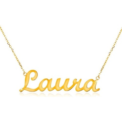 Náhrdelník ze žlutého 14K zlata, nápis - jméno Laura, jemný nastavitelný řetízek z drobných oválných oček.