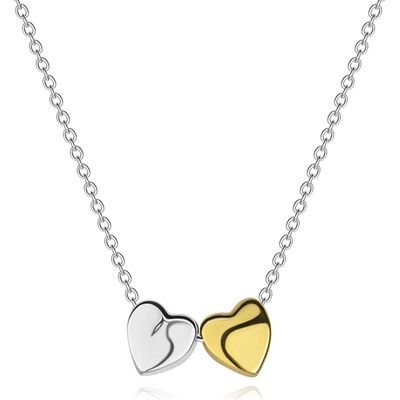 Stříbrný náhrdelník 925 tvoří jemný řetízek z oválných oček, který volně prochází přes dva přívěsky ve tvaru srdce – jeden v čistém stříbrném tónu, druhý ve zlaté barvě. Otvory...