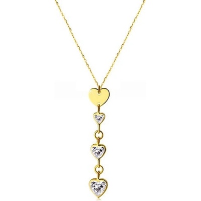 Lesklý zlatý 585 náhrdelník, zirkonová srdíčka s blýskavými odlesky, lesklé kontury srdcí, perový kroužek.