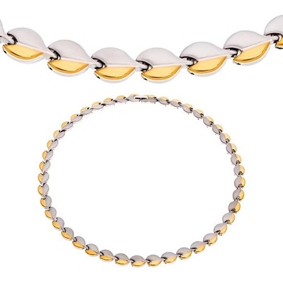 Náhrdelník z oceli 316L, články ve tvaru lístků ve stříbrno-zlaté barevné kombinaci, magnety a glazované kuličky.