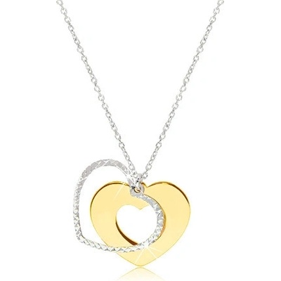 Stříbrný náhrdelník 925, hranatá očka řetízku, dvě symetrická srdce - větší ve stříbrném a menší ve zlatém odstínu.