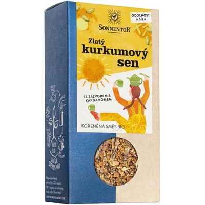 Sonnentor - Zlatý kurkumový sen, sypaný, BIO, 120 g Najděte opět ztracenou rovnováhu a dopřejte svému tělu zdravý doping v každé roční době. Krásná sytě žlutá barva a intenzivní kořeněná chuť vás okouzlí. S kapkou mléka pak získáte skvělou alternativu ke kávě a...