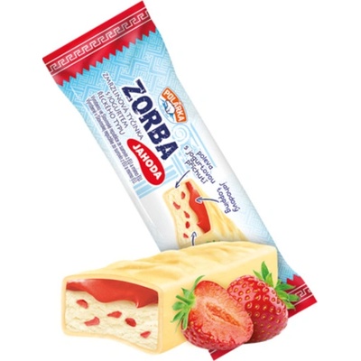 -- Zmrzlina s jogurtem řeckého typu s kousky jahod, jahodovým toppingem, přelitá jogurtovou polevou ve formě zmrzlinové tyčinky.