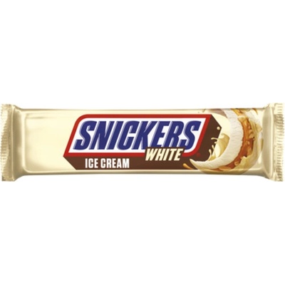 -- Oblíbenou tyčinkou Snickers inspirovaná zmrzlina. Mražený smetanový krém s praženými arašídy a karamelem, zalitý hladkou bílou polevou z kakakového másla.