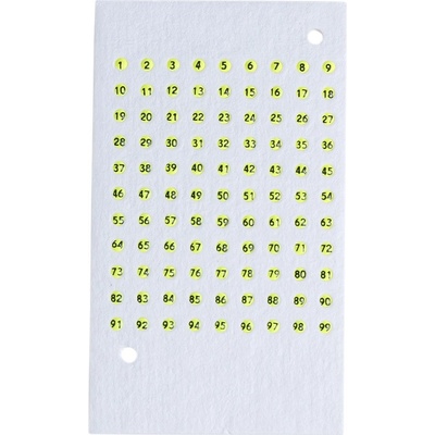 Dol Opalitové značky žluté na číslování včelích matek Balené jako arch, na archu je 100 ks v barvě značení. Každé balení obsahuje sadu čísel od 1 do 99. Na každý kalendářní rok...