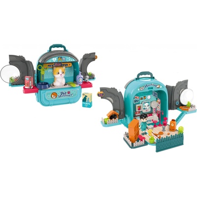 Nemocnice zvířecí v batohu kočka. Rozměry 50x35x30 cm. Velikost kočky 17 cm. Batoh je otevírací ze dvou stran. Balení obsahuje zařízení zvířecí ordinace, figurku kočky a příslušenství: misku, lahvičky, panenku zdravotní sestru, drobnosti do ordinace.