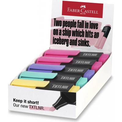 Stojánek s 10 kusy plochých zvýrazňovačů Faber-Castell Short TXTLNR SF ve čtyřech pastelových barvách.