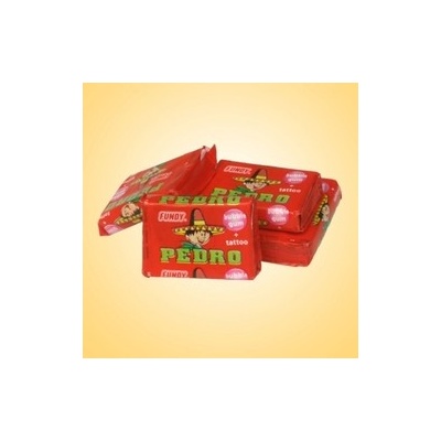 Tradiční žvýkačka Pedro s tetováním. Žvýkačka Pedro, která se vyráběla již před 50 lety. Stále stejné růžové jahodové žvýkačky, které mají na obalu panáčka s kloboukem. Pedro,...