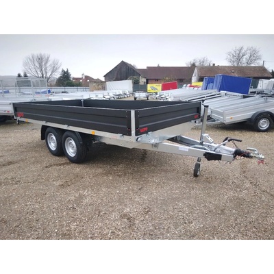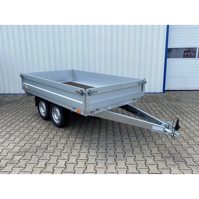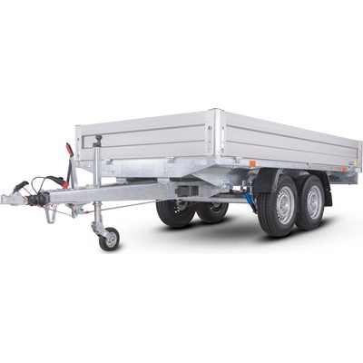 Odolný brzděný přívěs se svařovaným rámem s výztuhami pod podlahou a překližkovými bočnicemi. Přívěs je vybaven hydraulickým sklápěním ložné plochy. Ve standardní výbavě je...