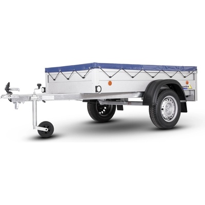 Jednonápravový, nebrzděný valníkový přívěs s koly vedle ložné plochy. Přívěs má hliníkové bočnice o výšce 350 mm a podlahu z voděodolné překližky. Zadní čelo přívěsu je...