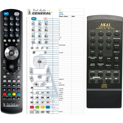 Náhradní dálkový ovladač AKAI RC-C55 ( RCC55) - 100procent náhrada 1:1 za originální dálkový ovladač. Dálkový ovladač je určen pro tyto modely AKAI: CD-29, CD-55, CD-A2100,...