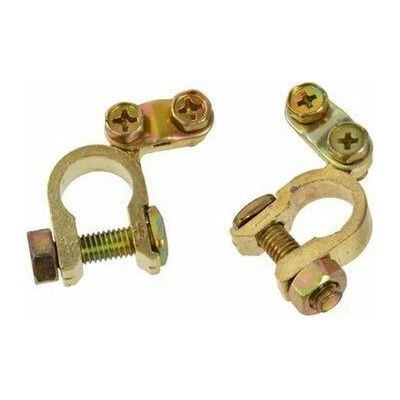 Sada dvou svorek pro připojení autobaterie, materiál olovo. Svorka pro montáž na kladný pól akumulátoru je označena znaménkem + .
