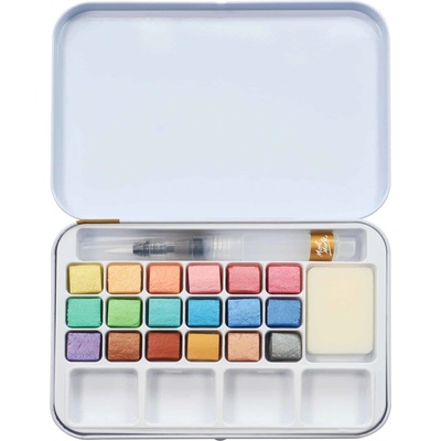 Sada metalických akvarelových barev. Krásná sada pro akvarelové malby na bílém i černém papíře. - 18 ks metalických akvarelových barev - houbička - paleta - střední vodové...