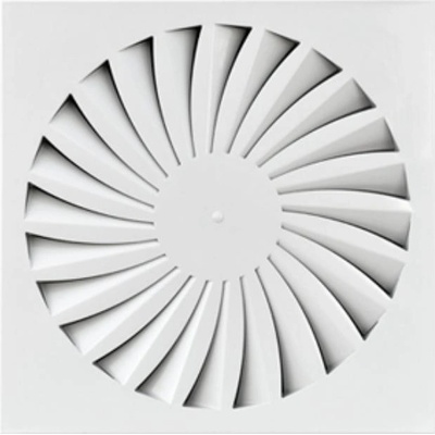 Vířivý anemostat s pevnými lamelami, volitelná konfigurace výtlaku nebo sání, s demontovatelnou středovou částí. Dle provedení lamel je možné vytvořit požadovaný obraz proudění...