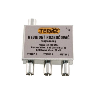 TECHNICKÉ PARAMETRY * Rozbočovač TV trojnásobný hybridní * IEC konektory * 1 vstup, 3 výstupy (1x4dB, 2x8dB) * V pásmu 40-862MHz * Průchozí útlum: 1 x 4 dB, 2 x 8dB *...