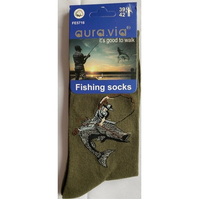 Kvalitní bavlněné pánské ponožky Fishing Socks. Pánské ponožky jsou v khaki zelené barvě s rybářskými motivy - viz ukázka ve fotogalerii. Při objednání 1 páru bude dodán motiv...