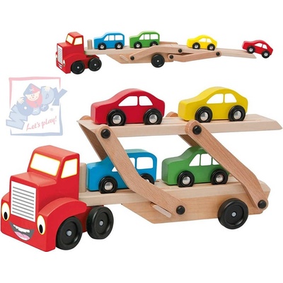 Tahač, návěs i auta jsou vyrobeny z tvrdého masivního dřeva. Dvoupatrová plošina pro auta se dá sklopit tak, aby auta mohla najet a zase sjet z rampy. Tahač a návěs se dají...