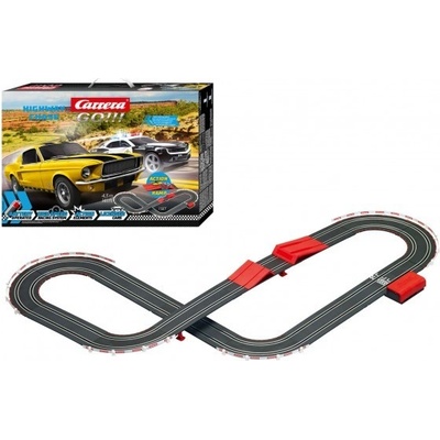Autodráha Carrera GO!!! dlouhá 4,3m s auty Ford Mustang a Chevrolet Camaro obsahuje skokánek, rovinky, zatáčky, přemostění, napájecí díl na baterie a další díly. Autodráha je...