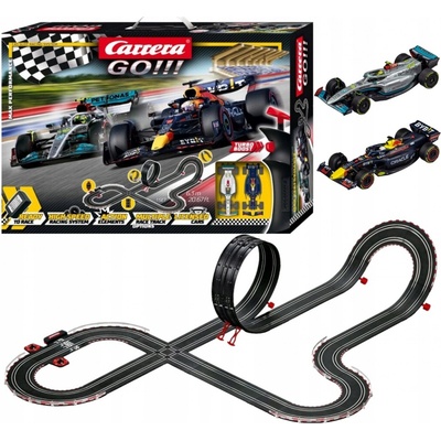 Autodráha Carrera GO!!! dlouhá 6,3m s auty F1 Mercedes a Red Bull, obsahuje looping, křižovatku, kolmou stěnu, rovinky, zatáčky, díl s počítadlem kol a další díly. Můžete si...