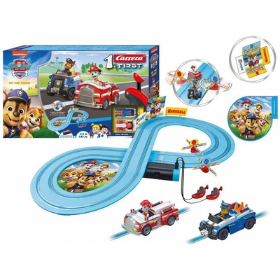 Autodráha Carrera FIRST dlouhá 2,4 m s auty ze seriálu Tlapková patrola, pro děti od 3 let, na baterie, obsahuje rovinky, zatáčky, točící vrtule, ovladače a dekorace s tématikou...