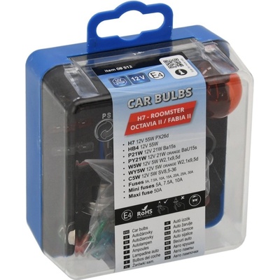 Plastová krabička náhradních autožárovek a pojistek vhodná pro vozy Škoda Fabia 3, homologace E. Balení obsahuje: 1ks H7 - 12V 55W PX26d 1ks PY21W - 12V 21W BaU15s orange 1ks...