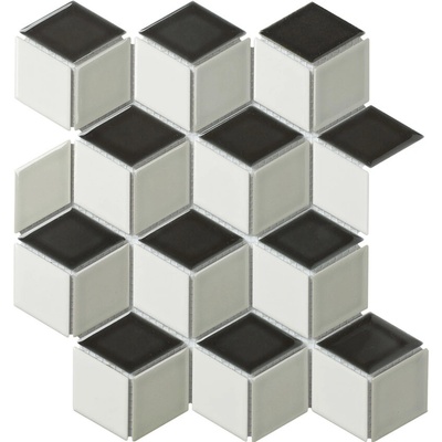 Keramická mozaika PACUMIX nabízí jeden z nejvýraznějších geometrických efektů v celé kolekci. Kombinace bílé, šedé, černé a černobílé v lesklém provedení dokonale podtrhuje 3D...