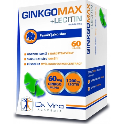Přípravek GinkgoMAX+Bacopa+Lecitin DaVinciAcademia obsahuje extrakt z Ginkgo biloby pro lepší paměť, extrakt z Bacopa monnieri a vysoký obsah lecitinu.