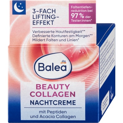 Balea Beauty Collagen noční krém s kolagenem a pupalkovým olejem napomáhá k výraznému zmírnění vrásek a zlepšení elasticity pokožky. Přírodní kolagen z akácie chrání pokožku a...
