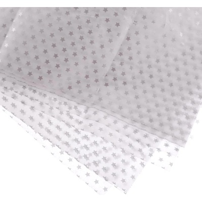 Balicí, hedvábný, tenký papír v bílé barvě se stříbrnými hvězdičkami. Rozměr: 50 x 60 cm Balení: 5 ks Cena je uvedena za 1 balení.