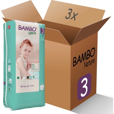 Výhodné balení 3x Bambo Nature 3 M (4-8kg / 52ks výhodné balení) - Indikátor vlhkosti - Flexibilní opasek a nožní manžety bez obsahu latexu. - Plenky Bambo Nature neobsahují...