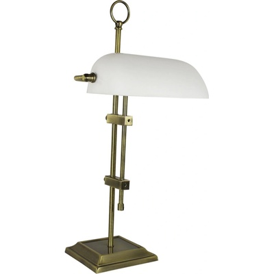 Stolní bankovní lampa Globo Antique. - Podstavec ve staromosazné barvě. - Stínidlo z bílého skla. - Vypínač na kabelu. - Žárovka E27 není součástí.