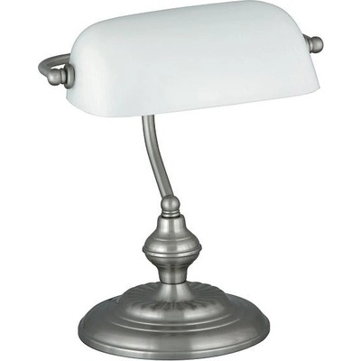 Stolní bankovní lampa Rabalux BANK. - Podstavec ve stříbrné barvě. - Stínidlo z bílého skla. - Vypínač na kabelu. - Žárovka E27 není součástí.