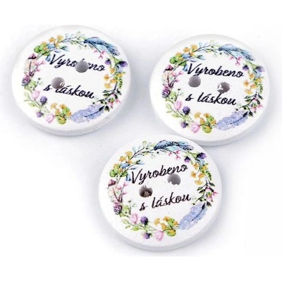 Dřevěné dekorační knoflíky zdobí květinový potisk a nápis "Vyrobeno s láskou". Vyniknou na ručních výrobcích, dárcích a různých dekoracích. Můžete je použít také ve...
