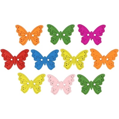 Balení obsahuje barevné knoflíky ve tvaru motýlů. Dětské knoflíky mají rozměry 2,4 x 1,8 cm. Tloušťka dřeva je 0,3 cm. Dřevěné knoflíky mají různé barvy. Balení obsahuje 10 kusů...