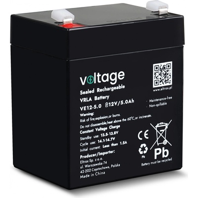 Akumulator AGM Voltage 12V 5.0Ah VE12-5.0 - najważniejsze cechy: - Napięcie nominalne: 12V - Pojemność nominalna: 5Ah - Żywotność projektowana 5 lat (25 ° C) - Akumulator nie...