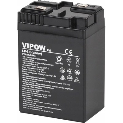 Baterie olověná 6V 4.0Ah VIPOW Olověné hermeticky uzavřené a zcela bezúdržbové akumulátory. Konstrukce těchto akumulátorů umožňuje libovolnou pracovní polohu. Doporučené...