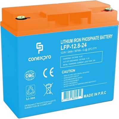 LiFePO4 baterie značky Conexpro s výstupním napětím 12,8 V, kapacitou 24 Ah (307 Wh), až 5x delší životností než u olověné baterie, dvěma M5 konektory pro připojení k zařízení a...