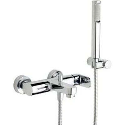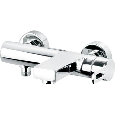 Páková nástěnná vanová baterie se sprchovým setem. V oblém designu. V chromovém provedení. Rozteč baterie 150 mm.