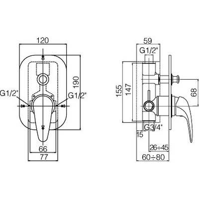 Sprchová nástěnná páková baterie bez sprchového příslušenství - kartuše 35 mm - rozměr šířka baterie 262 mm - rozteč 150 mm - krytky etážek o průměru 60 mm - G 1/2"...