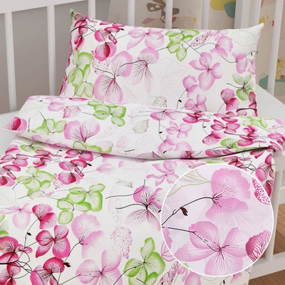 Dětské bavlněné povlečení do postýlky se vzorem růžovo-zelených květů na bílém podkladu. Je ušité z hustě tkaného 100% bavlněného plátna s certifikátem zdravotní nezávadnosti...