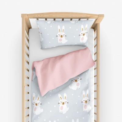 Povlečení do postýlky z řady Duo má z jedné strany motiv zasněných králíčků a ze druhé strany jednobarevné pudrově růžové provedení (platí pro celé povlečení - povlak...