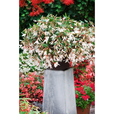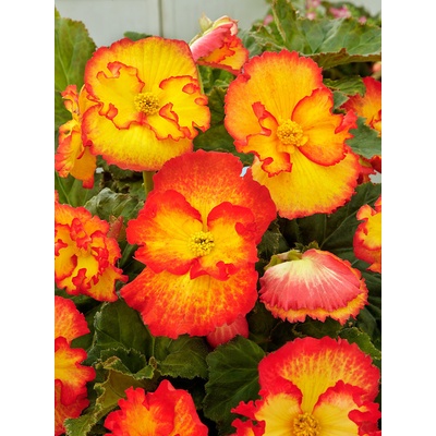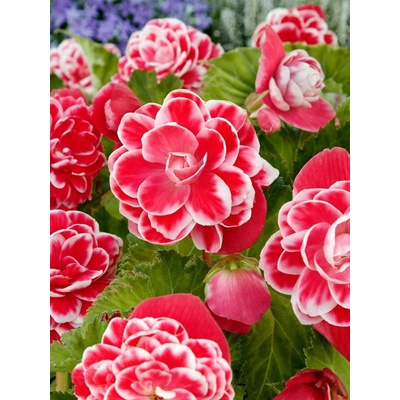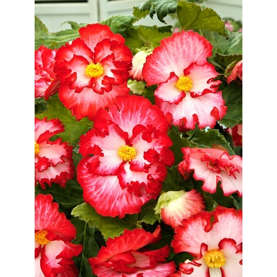 Velké květy této begónie mají silně zkadeřený až krepovaný červený okraj lemující zářivě bílé okvětní lístky. Krásné, kontrastní květy oživí slunná i mírně zastíněná místa teras...