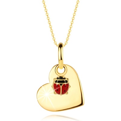 Náhrdelník ze žlutého zlata 585, lesklá silueta srdce, beruška s černou hlavičkou, červená křídla, 4 tečky.