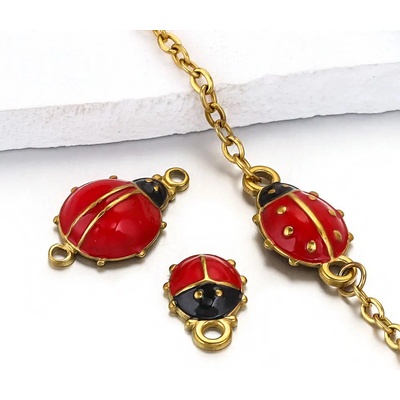 Konektor Beruška zlatá galvanizace Materiál: chirurgická ocel 304 Galvanizace: zlatá galvanizace, barevný email Rozměry: 18,70 x 10,20mm Cena za jeden kus Množství kusů skladem...