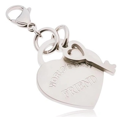 Přívěsek na klíčenku, chirurgická ocel stříbrné barvy, srdíčkovitý zámek s klíčkem a nápisem WORLD´S BEST FRIEND.