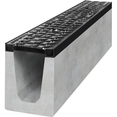Rovný betonový odvodňovací žlab s litinovou mříží a únosností až 12,5 tuny. Určen pro odvodnění zpevněných ploch domácích příjezdových cest, u rodinných domů, vjezdů do garáží,...