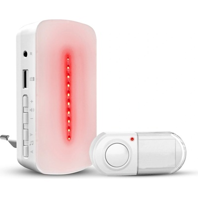 Bezdrátový zvonek s možností nahrání vlastní melodie MP3, nastavitelnou hlasitostí a světelnou indikací na přijímači.