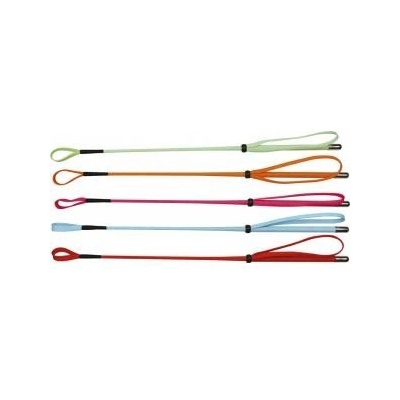 Dětský jezdecký bičík se sklolaminátovým jádrem opleteným polyprolylenovým vláknem. Plácačka a rukojeť z polypropylenu. Kovový knoflík na konci rukojeti. Délka 53 cm. Krásné veselé barvy.