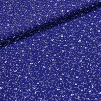 Bavlněná látka (tkanina) se vzorem bílých květinek s lístky na modrém podkladu. Látka je v šířce 140 cm, vyrobena ze 100% bavlny (gramáž 135g/m2) v plátnové vazbě. Vzor látky je...